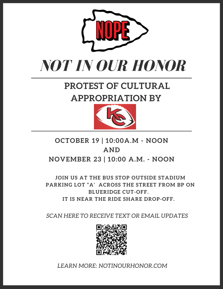 Not In Our Honor has led protests against the Kansas City Chiefs, opposing the tomahawk chop and advocates against the use of Native American imagery in sports.