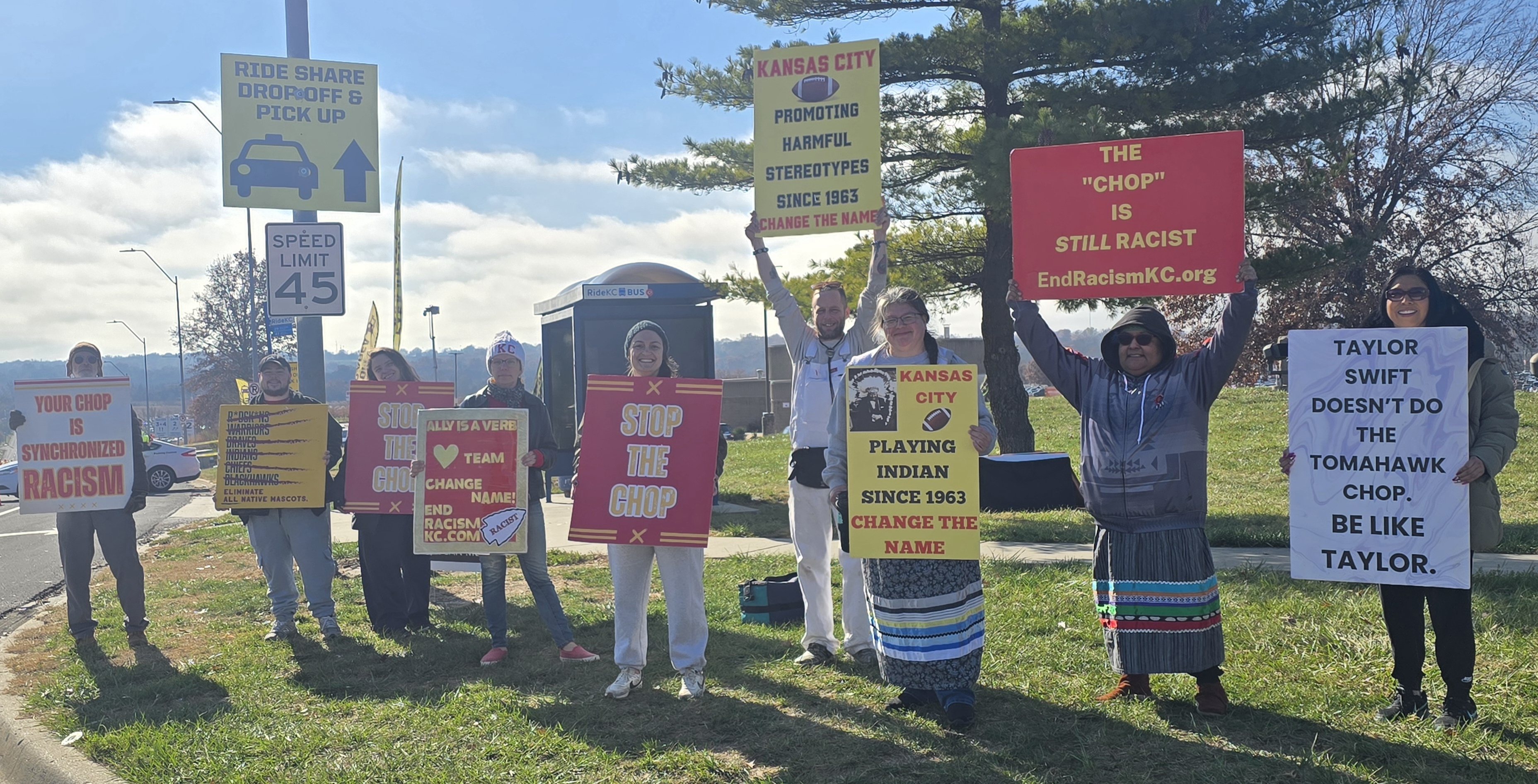 Today’s protest for Native American Heritage Month at the KC vs. Indiana Colts game, we stand together in honor of mentor Dr. James Riding In (Pawnee), who passed away recently. Dr. Riding In stood with Not In Our Honor when we were in Arizona for the Super Bowl. He supported our movement, prayed for our safety, and was always a vocal advocate against cultural appropriation in sports. We admire everything he has done for Native people. Dr. Riding in was a Haskell alumnus and a Veteran. Thank you Dr. Riding In, prayers to your family and all your friends you impacted.